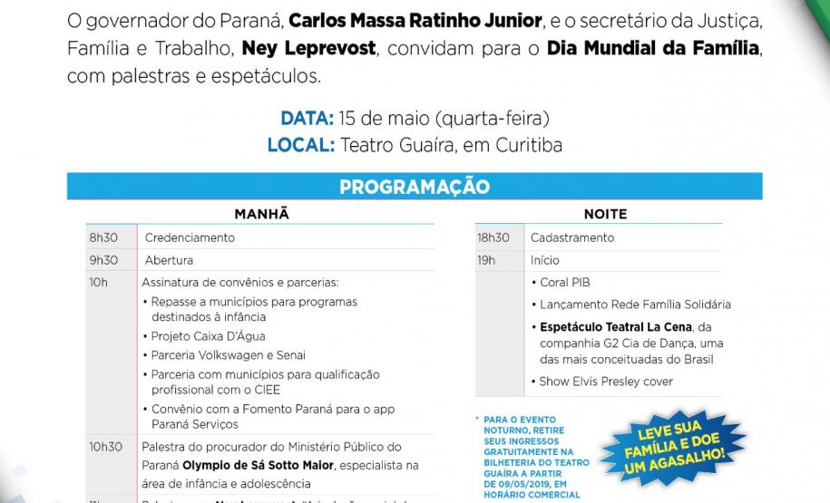 No Dia Internacional da Família (15 de maio, quarta-feira), o Governo do Estado, por meio da Secretaria de Justiça, Família e Trabalho (Sejuf), promove um evento especial no Teatro Guaíra, em Curitiba, com palestras, assinaturas de convênios com municípios e empresas e apresentação de espetáculos com entrada franca para as todas as famílias. Também será lançada uma grande rede de voluntariado, a Rede Família Solidária.