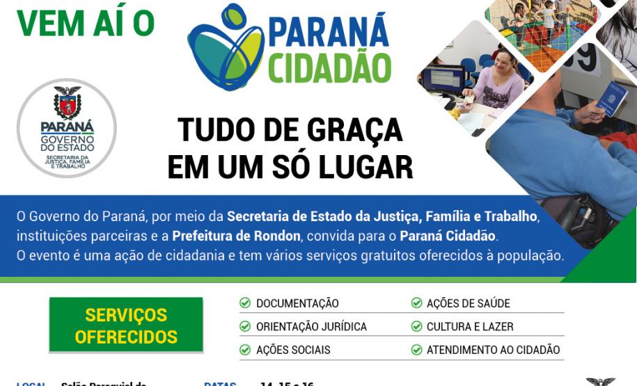 Os moradores de Rondon, município localizado no Nororeste do Paraná recebem nesta semana diversas ações gratuitas com a feira de serviços Paraná Cidadão. O mutirão de cidadania acontece a partir de quarta-feira (14), no Salão Paroquial da Igreja Matriz de Rondon, das 9h até ás 17h. Serão ofertados de graça serviços para a emissão documentos pessoais (carteira de identidade, RG e CPF), além dos serviços para intermediação das vagas de emprego, cadastro para a tarifa social de água e luz e cadastro no ID Jovem.