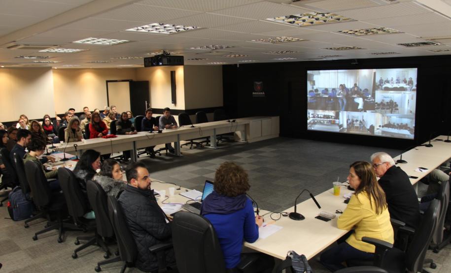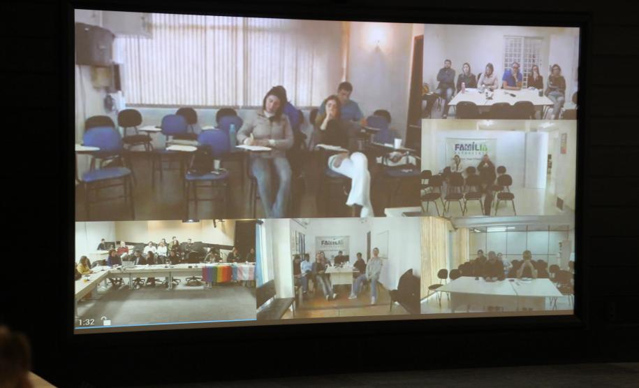 A Secretaria da Justiça, Família e Trabalho do Governo do Paraná (Sejuf), por meio da Escola de Educação em Direitos Humanos (Esedh), promoveu nesta quinta-feira (06/06), em Curitiba, videoconferência com servidores que atuam nas Unidades Socioeducativas do Paraná. A videoconferência foi transmitida aos Escritórios Regionais da Sejuf, nos municípios de Campo Mourão, Cascavel, Foz do Iguaçu, Laranjeiras do Sul, Londrina, Maringá, Paranavaí, Pato Branco, Ponta Grossa, Santo Antonio da Platina, Toledo e Umuarama.